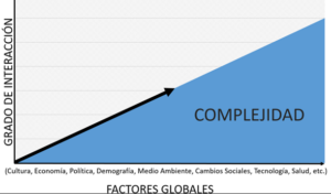 Respecto al grado de complejidad del conocimiento, Simon, (como se citó en Segarra M y Bou J., 2004) “…sintetiza la complejidad en torno a dos ejes: el número de elementos que componen un sistema y el grado de interacción entre estos elementos.”. Con base en lo anterior se concibe el modelo que muestra que entre más factores globales concurrentes en el aula (cultural, económico, político, demográfico, ambiental, social, tecnológico, de salud, entre otros), mayor grado de interacción; por lo tanto mayor grado de complejidad en el ambiente educativo aula, como se muestra en la Figura 1.
